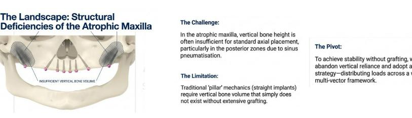 This configuration converts individual implant loads into a distributed, triangulated force system, reducing stress on each implant and enabling stable rehabilitation even in severely atrophic maxillae.